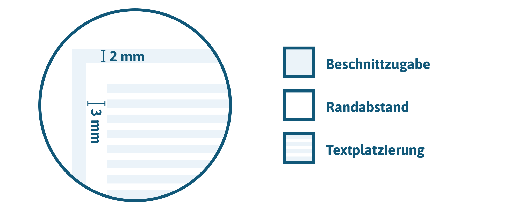 Elemente wie Texte, Logos und andere Gestaltungselemente sollten mindesten 3 mm Randabstand zur Schnittkante haben und somit insgesamt mindestens 5 mm zum Rand, um zu vermeiden, dass diese beim Zuschnitt des Endformst angeschnitten werden.