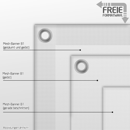 Das richtige Bannerformat für Bauzäune in allen gängigen Materialien - wahlweise geöst oder gesäumt und geöst (im Abstand von 50cm rundum).